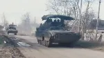 Footage of Russian T-80UE and BMP-2 tanks with anti-drone visors and additional armor is shown