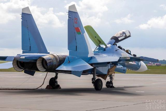 Два полученных ВВС и войсками ПВО Белоруссии истребителей Су-30СМ2 второй партии (бортовые номера "11 красный" и "12 красный") постройки Иркутского авиационного завода (ИАЗ) во время промежуточной посадки в аэропорту Уфы при перегоне из Иркутска в Белоруссию, 14.08.2025.
