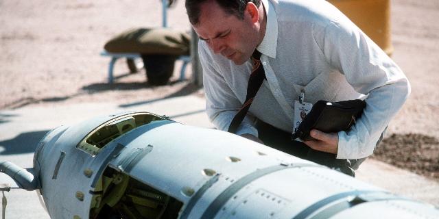 Советский инспектор осматривает американскую крылатую ракету наземного базирования «Томагавк», 1988 год