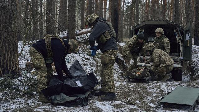 Медики помогают тяжело раненому боевику ВСУ.