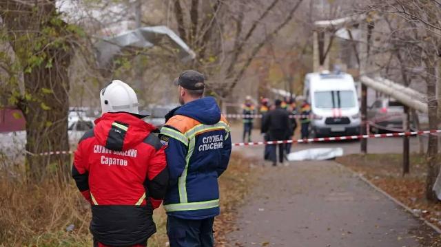 Экстренные службы на месте атаки беспилотников в Саратове.
