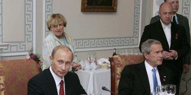 Президент России Владимир Путин и президент США Джордж Буш-младший принимают участие в рабочем ужине с другими лидерами стран Большой восьмерки, российский бизнесмен Евгений Пригожин стоит справа. Санкт-Петербург, Россия. 19 июля 2006 года.