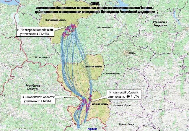 Схема уничтожения беспилотных летательных аппаратов вооруженных сил Украины, действовавших в направлении резиденции Президента Российской Федерации.