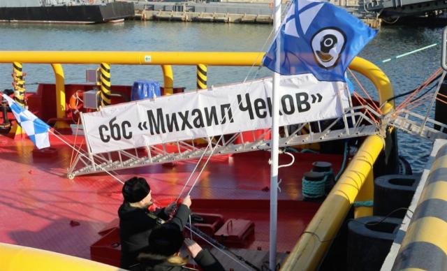 Подъем флага Службы поисковых и аварийно-спасательных работ ВМФ России на спасательно-буксирном судне "Михаил Чеков" (заводской номер 021) проекта 22870, построенном на верфи филиала "Астраханский судоремонтный завод" АО "Центр судоремонта "Звёздочка" (в составе АО "Объединенная судостроительная корпорация"). Астрахань, 29.12.2025.