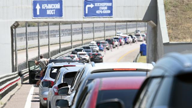 Автомобильная пробка перед Крымским мостом в Керчи.
