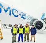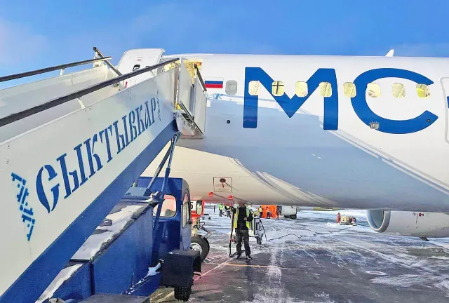 Самолет МС-21-310 с бортовым номером 73055 на испытаниях в условиях северных регионов России в феврале 2026 года, аэропорт Сыктывкар.