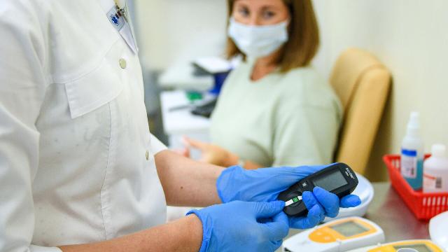 Измерение уровня сахара в крови глюкометром.