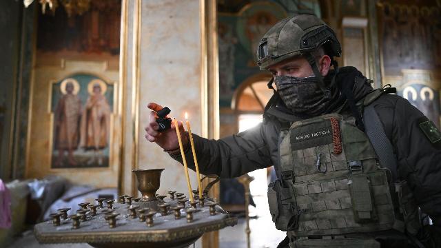 Военнослужащий осматривает Свято-Михайловский храм в Авдеевке.