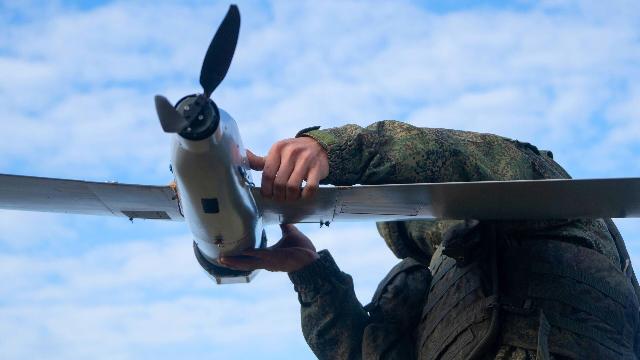 Военнослужащий ВС РФ запускает разведывательный беспилотный летательный аппарат.