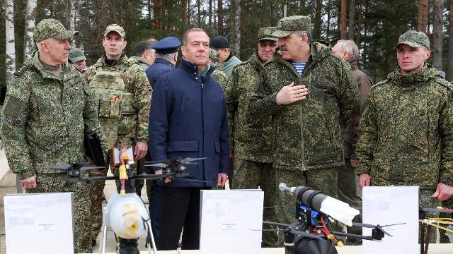 Заместитель председателя Совета безопасности РФ Дмитрий Медведев во время осмотра учебного центра Ленинградского военного округа.