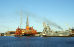 В наливном бассейне Севмаша продолжается ремонт крейсера проекта 11442М. Выполнен значительный объем корпусных работ, специалисты готовятся к монтажу валопровода. Подготовка к монтажу и центровке линии вала ведется с использованием 3D-технологий.