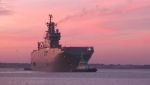 Построенный для ВМФ России на французском судостроительном предприятии STX France в Сен-Назере десантный вертолетный корабль-док "Владивосток" типа Mistral впервые выходит в море с российским экипажем на борту. Сен-Назер, 13.09.2014 (с).