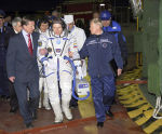 Первый вице-премьер правительства РФ Сергей Иванов, командир корабля "Союз ТМА-10" во время полета Олег Котов и руководитель Федерального космического агентства Анатолий Перминов перед стартом ракеты-носителя "Союз-ФГ" на космодроме Байконур, 2007 год.