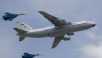 Стратегический военно-транспортный самолет Ан-124 "Руслан" в сопровождении двух истребителей Су-27.