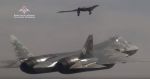 Первый опытный образец-демонстратор российского тяжелого разведывательно-ударного беспилотного летательного аппарата С-70 по теме "Охотник" (бортовой номер "071 красный") в первом совместном полете с опытным образцом истребителя пятого поколения Су-57. Ахтубинск (Астраханская область), сентябрь 2019 года.
