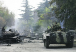 Российские солдаты проезжают мимо разрушенного грузинского танка, август 2008. Фото Reuters.