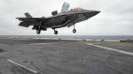 Американский истребитель F-35B Lightning II совершает посадку на палубу десантного корабля типа "Уосп".