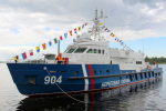 Спуск на воду на АО "Судостроительный завод "Вымпел" построенного для Береговой охраны Пограничной службы ФСБ России пограничного сторожевого катера (патрульного катера) проекта под шифром "Ламантин" в речном исполнении (заводской номер 01409). Рыбинск, 28.05.2020.