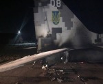 Выгоревший в результате столкновения с автомобилем Volkswagen Touran на аэродроме Васильков в Киевской области истребитель МиГ-29МУ1 (тип 9.13, бортовой номер "08 белый", заводской номер 2960731239) из состава 40-й бригады тактической авиации Воздушных сил Украины, 10.03.2021.
