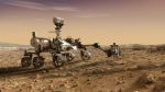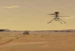 Фотография дрона Ingenuity в полете, сделанная левой навигационной камерой ровера Perseverance (Navcam), которая расположена на его мачте. Расстояние между роботами — несколько десятков метров. Снимок увеличен и произведена цветокоррекция.