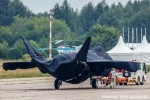 Доставленный на аэродром АО "Летно-исследовательский институт имени М.М. Громова" в Жуковском закрытый брезентом полноразмерный макет (или первый опытно-экспериментальный образец?) российского перспективного легкого однодвигательного истребителя пятого поколения, разрабатываемого ПАО "Компания "Сухой" (в составе АО "Объединенная авиастроительная корпорация"), по, предположительно, программе ЛТС ("Легкий тактический самолет"), 15.07.2021.