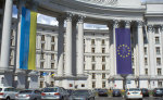 Флаги Украины и ЕС на здании МИД Украины.