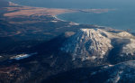 Вид на вулкан Менделеева и поселок Южно-Курильск на острове Кунашир.