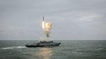Малый ракетный корабль "Град Свияжск" запускает ракету "Калибр".