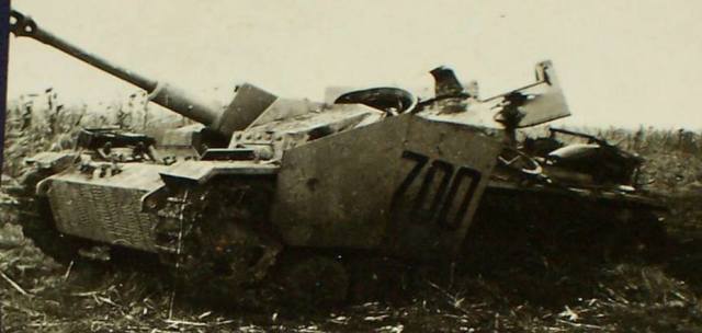Снимок штурмового орудия StuG III №700 командира 2-й батареи 7-го батальона штурмовых орудий, уничтоженного 26 сентября у г. дв.Ракоши в бою с танками 110-й тбр и самоходками 1438-го сап.