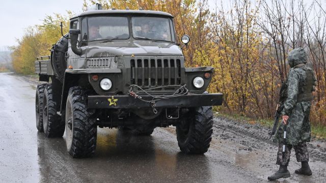Проверка грузовика на блокпосту в Харьковской области.