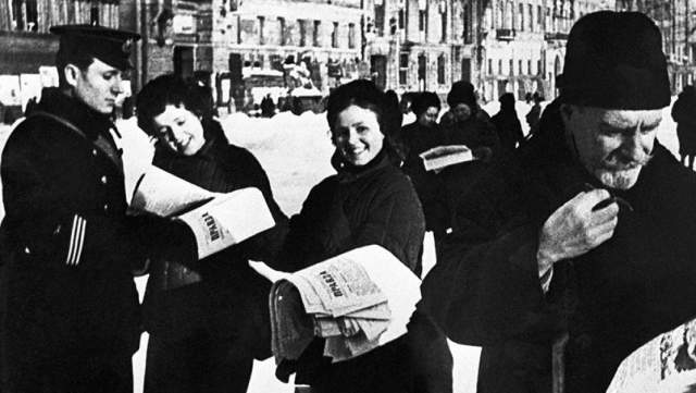 Ленинградцы читают номер газеты «Правда» с сообщением о прорыве блокады Ленинграда.