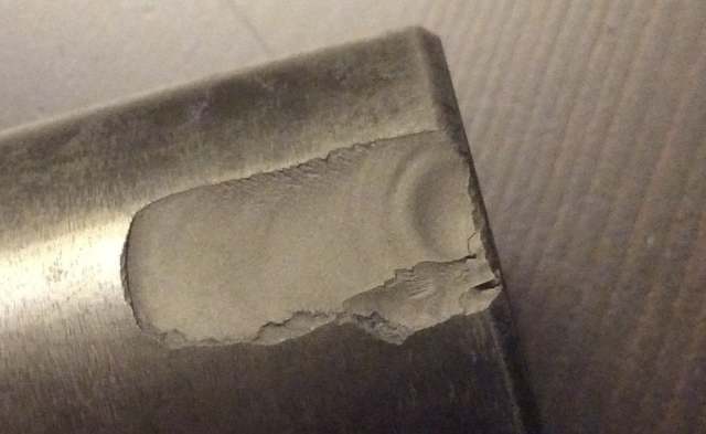Скол материала карбид-вольфрамового сердечника советского бронебойного 100-миллиметрового снаряда 3БМ8 крупным планом. Виден раковинообразный характер скола, говорящий о высокой однородности материала. Такие сколы легко наносятся рукой, вооруженной легким молотком или другим сердечником. Фото автора.