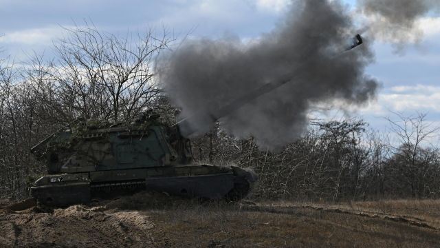 Самоходная артиллерийская установка (САУ) "Мста-С" на боевой позиции в южном секторе спецоперации.