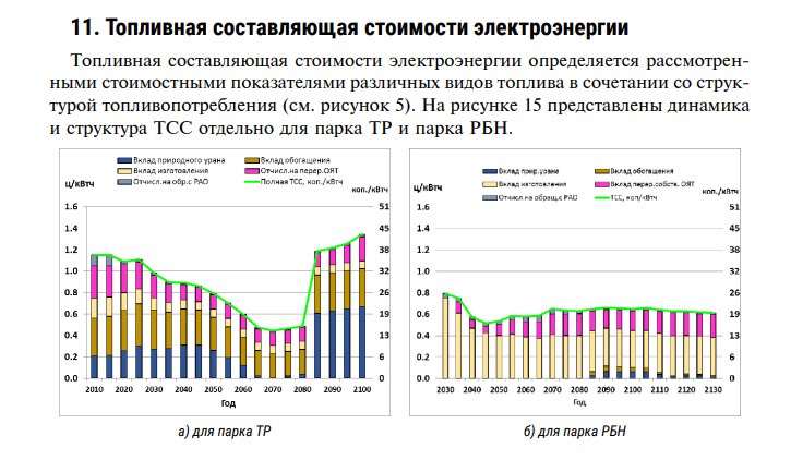 Текущая системная стоимость электроэнергии (с учетом всех системных затрат) существенно снижается от 5,8 до 3,6 ц/кВт•ч к концу века по мере увеличения доли РБН в генерирующих мощностях. Ее приведенное значение (тариф безубыточности, SLCOE), также показанное на рисунке, определено при норме дисконта 5%, что соответствует адекватному учету будущих затрат на достаточно протяженном интервале времени. По аналогии со стоимостью электроэнергии определена и приведенная системная топливная составляющая (с учетом полных топливных затрат в замкнутом ЯТЦ), ее величина не превышает 20% от SLCOE."