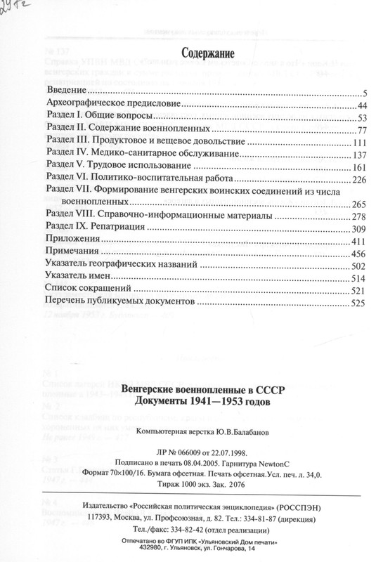 Венгерские военнопленные в СССР: Документы 1941-1953 годов / Сост. Д.И. Борисов и др. — М.: РОССПЭН, 2005. — 544 с., ил.; ISBN 5-8243-0659-1.