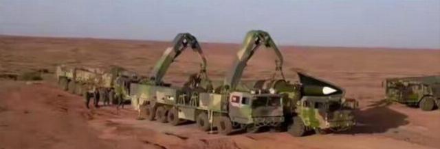 Момент погрузки ракеты DF-26 с транспортно-заряжающей машины на мобильную ПУ (запечатлен момент в рамках учений, проведенных в октябре 2024 года)